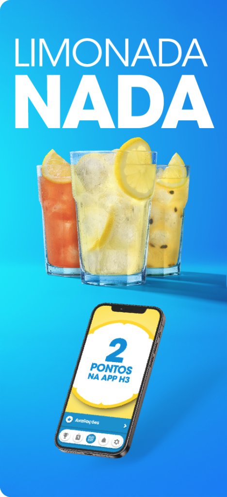 Até 10 de maio, os clientes fidelizados merecem mais: ao escolherem um menu h3 com Limonada Zero nos restaurantes aderentes (Amoreiras Shopping Center, Cascais Shopping, Parque das Nações, Mar Shopping Matosinhos e Alameda), ganham 2 pontos na app h3.
