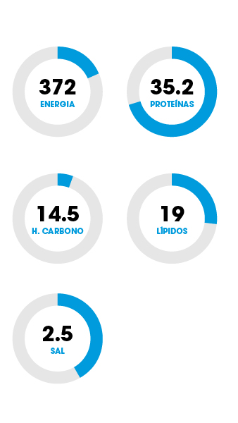 Lípidos 21.8g (31%) dos quais saturados 9.8g (49%) Hidratos de carbono 0.7g (0%) dos quais açúcares 0.7g (0%) Fibra 1.8g Proteínas 35.1g (70%) Sal 0.7g (12%)Cebola confitada